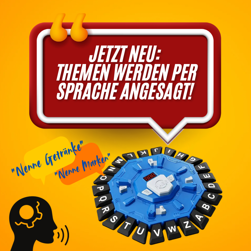 Kein lästiges Kartenziehen mehr! Einfach auf „Start“ drücken und das Gerät nennt dir per Sprache ein zufälliges Thema. So wird jede Runde einzigartig!